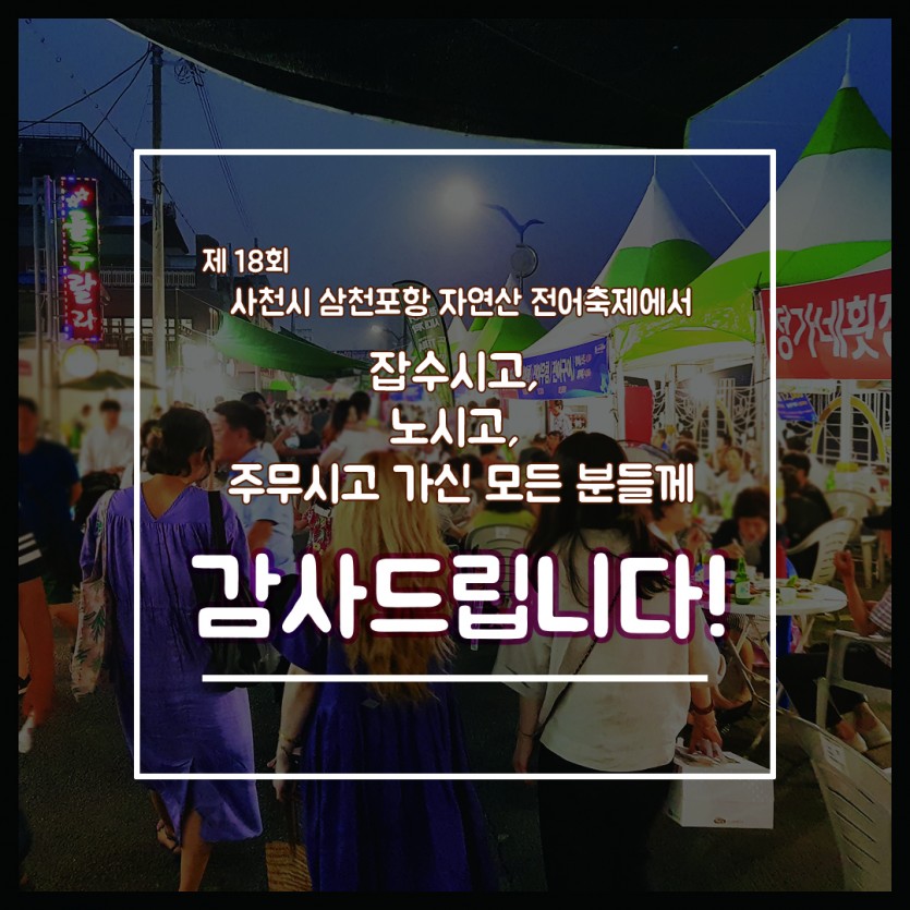 제18회 사천시 삼천포항 자연산 전어축제 행사 종료 안내 페이지 정보 작성자 관… 작성일19-07-30 17:46 조회5,503회 관련링크 이전글 다음글 목록 본문 제18회 사천시 삼천포항 자연산 전어축제에 많은 관심과 방문 감사드립니다. 내년에는 더욱 발전된 모습으로 준비하여 찾아오겠습니다. 이전글 다음글 목록