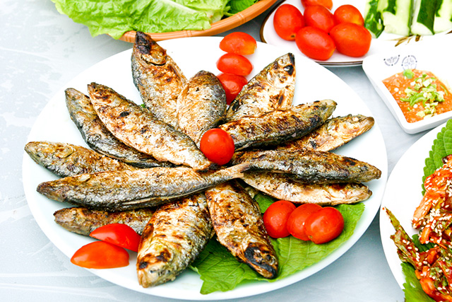 전어를 통째로 구운 것으로 구수한 냄새가 입맛을 자극합니다. 살을 일일이 발라먹는 것보다 한마리 통째로 잡아 뜯어 먹어야 전어구이의 고소한 맛이 전해집니다.
